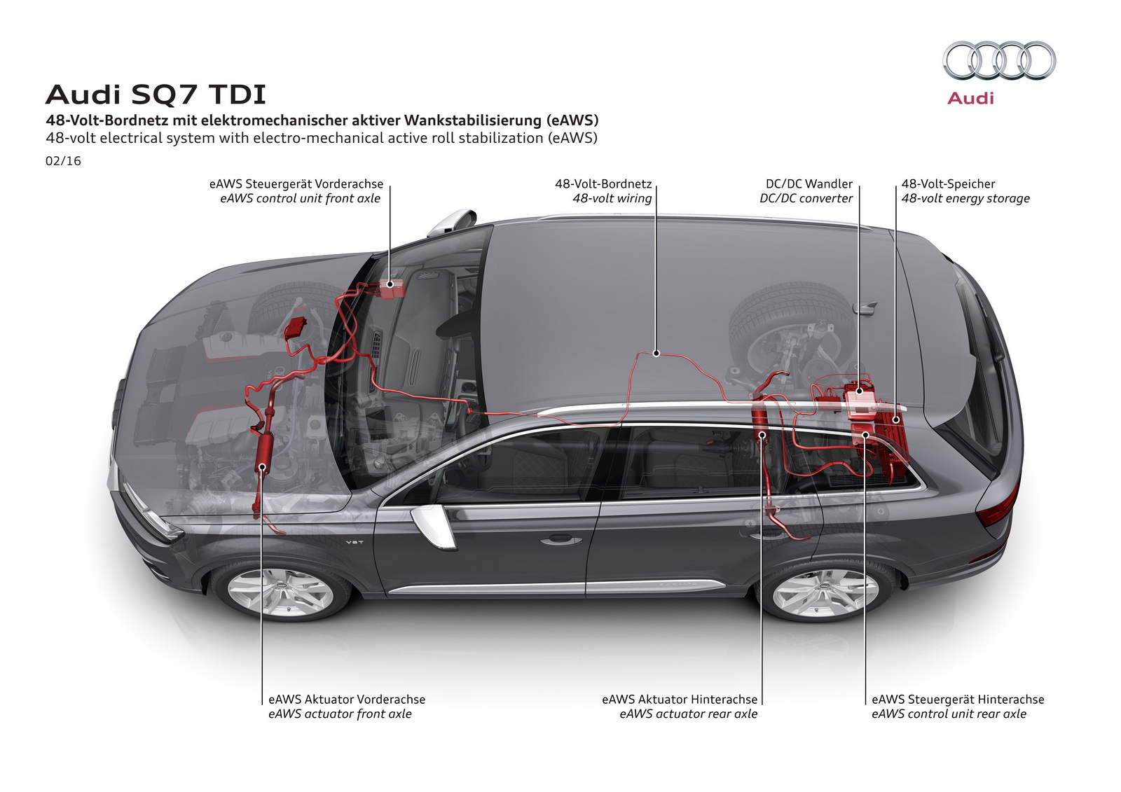Audi SQ7’nin etkileyici tarafları sadece motor ve performans ile de sınırlı değil. Araçta elektro-mekanik adaptif havalı süspansiyon sistemi de bulunuyor ve bu sistem gücünü elektrikli turbonun da gücünü aldığı 48 voltluk aküden elde ediyor. Bu becerikli süspansiyon sistemi 4 tekerlek üzerinde de farklı şekilde çalışabiliyor ve bu sayede yol tutuşa büyük katkıda bulunuyor. Ayrıca 4WS yani 4 tekerleği de döndürebilen direksiyon sistemi yol tutuşu daha da mükemmel bir hale getirebiliyor. Modelde AWD yani sürekli 4 çeker sistemi olduğunu da belirtmeden geçmek istemiyoruz.