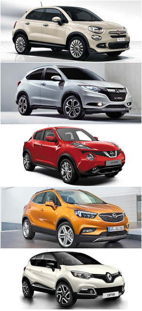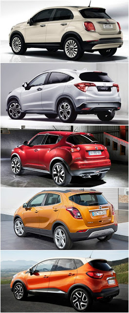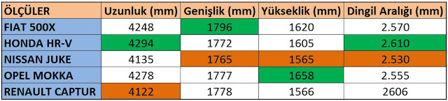 | Fiat 500X-Honda HR-V-Nissan Juke-Opel Mokka-Renault Captur ölçüler (yeşil en büyük – turuncu en küçük) |