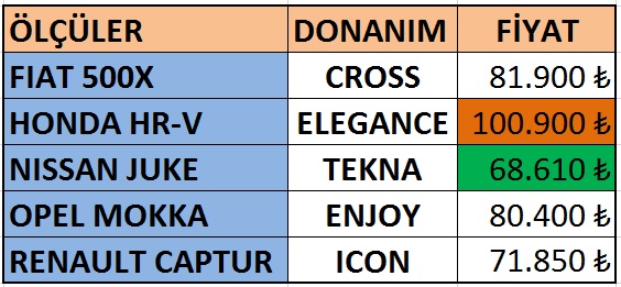 | Fiat 500X-Honda HR-V-Nissan Juke-Opel Mokka-Renault Captur fiyatlar (yeşil en ucuz – turuncu en pahalı) |