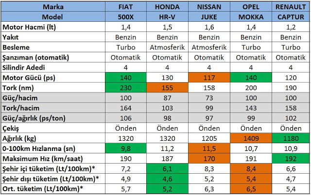 | Fiat 500X-Honda HR-V-Nissan Juke-Opel Mokka-Renault Captur teknik ve performans (yeşil en iyi – turuncu en kötü) |