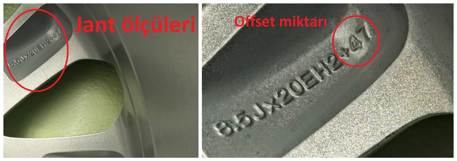 Aşağıda bulunan fotoğrafta aynı araca iki farklı jant uygulaması görülebilir. Bu jantlardan fabrika çıkışı orijinal olanı sol tarafta sonradan takılan ise sağ tarafta bulunuyor. Sol taraftaki jant 8 inch genişliğinde (8inch x 2.54 = 20.32cm) ve +47mm ofset değerine sahipken, sağdaki jant 8.5 inch genişliğinde (8.5inch x 2.54 = 21.59cm) ve +39mm ofset değerine sahip. İkinci jant hem daha geniş olması dolayısı ile hem de offset değeri orijinale göre daha düşük olması nedeniyle jantın dışarıya doğru yaklaştığı açık bir şekilde görülebilir. Şimdi ise elimizdeki değerlerden sağdaki jantın orijinal janta göre ne kadar dışarı çıktığını hesaplayalım.