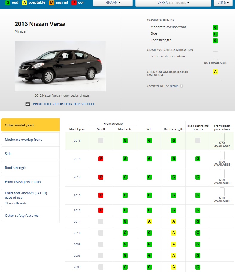 IIHS Small Overlap testinde zayıf sonuç alan Nissan Versa detaylı değerlendirmesi (P-kırmızı: zayıf)