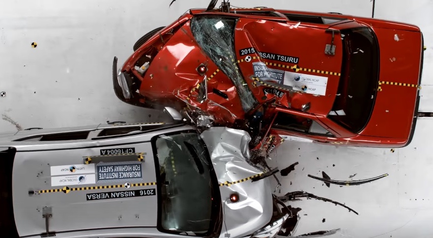 Yapılan bu test oldukça çarpıcıydı ve tabir-i caiz ise ibretlik bir karşılaşmaydı. Euro NCAP’in A.B.D versiyonu diyebileceğimiz ve daha sert kriterler uygulayan IIHS tarafından yapılan bu çarpışma testinde bir tarafta Meksika’nin en ucuz sedan modeli olan Nissan Tsuru (Sunny) ve diğer tarafta da A.B.D’nin en ucuz sedan modeli olan Nissan Versa karşı karşıya geldi. Bu arada Nissan Versa modeli bazı pazarlarda Sunny adıyla da satılıyor ve bulunduğu sınıf itibariyle de 1982 yılında üretilmeye başlanan Sunny modelinin günümüze bir yansıması denilebilir. Kısacası 1990 yılında tasarlanan sub-kompakt sedan bir model ile günümüz için tasarlanan sub-kompakt sedan bir model karşı karşıya geldi.