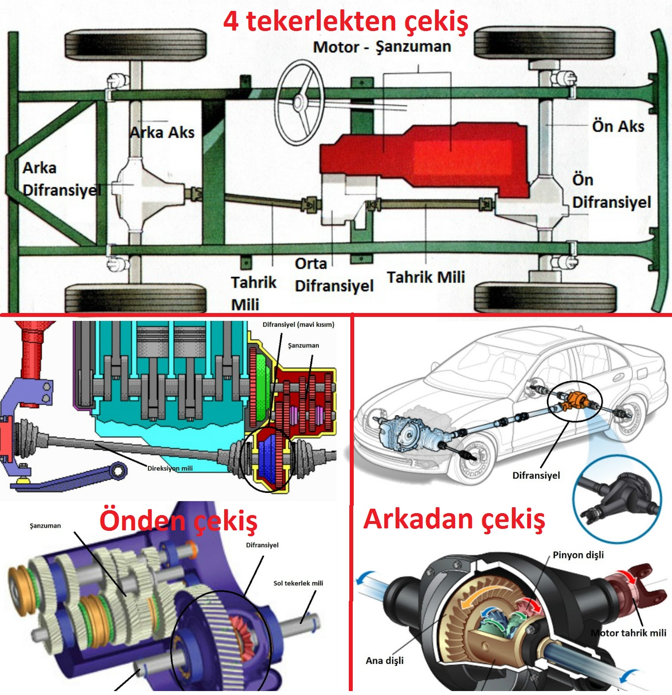 | 4×4, arkadan ve önden çekiş diferansiyel konumlanması |