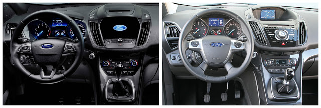 Aracın kokpitinde ise bilgi-eğlence sisteminin konumunun değişmesi sonucu bambaşka bir tasarım elde edilmiş. Boyutları öncekine göre devasalaşan 8 inc büyüklüğünde Apple Car Play ve Android Auto destekli yüksek çözünürlüklü ekran sayesinde Ford Kuga artık çok daha şık, kullanışlı ve modern bir kokpite sahip. Diğer taraftan 4 kollu direksiyon simidi yerini 3 kollu direksiyon simidine bırakmış. Bir diğer önemli değişiklik de mekanik el freni kolu yerine elektronik olan ve düğme ile kontrol edilen bir el freninin kullanılacak olması.