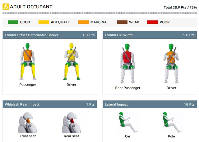 Önden deforme olabilen (Frontal Offset) bir bariyere çarpma testinde; sürücünün boyun, baldır ve ayak bölgeleri iyi bir şekilde korunurken, gövdesi, başı ve bacakları yeterli düzeyde korunabiliyor. Aynı testte yan yolcu ise göğsünden orta düzeyde hasar alırken, bacakları yeterli düzeyde, baş ve baldır bölgesi de iyi düzeyde korunuyor.