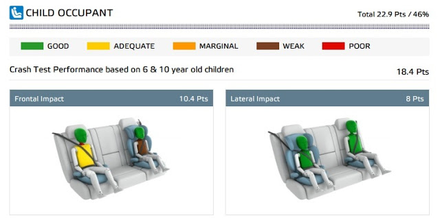 Önden çarpışmalarda (Frontal Impact) işler değişiyor ve sağda oturan 10 yaşındaki çocuğun boynu kötü derecede hasar alırken gövdesi yeterli derecede korunuyor. Solda oturan 6 yaşındaki çocuk için ise gövde ve boyun koruması zayıf bir şekilde testten ayrılıyor. (Sonuç ve çarpışma testi videosu görselden sonra yer almaktadır)