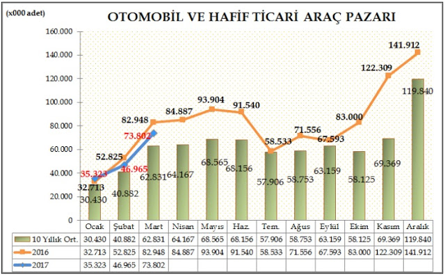 - Türkiye otomobil ve hafif ticari araç toplam pazarı, 2017 yılı ilk üç ayında bir önceki yılın aynı dönemine göre %7,36 azalarak 156.090 adet olarak gerçekleşti. 2016 yılı üç aylık dönemde 168.486 adet toplam pazar gerçekleşmişti.