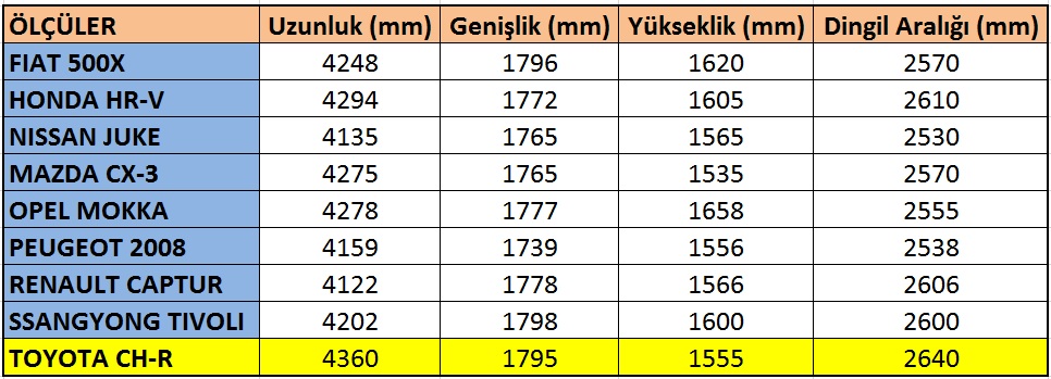 Oldukça hızlı gelişen B Segmenti Crossover sınıfında yakında VW T-Roc modeli de tanıtacak ve sınıfın diğer modelleri olarak Nissan Juke, Opel Mokka, Renault Captur, Fiat 500X, SSangYong Tivoli ve biraz daha büyük bir kasaya sahip olsalar da Toyota C-HR ve Honda HRV modellerini sayabiliriz. Hyundai’nin yeni tanıttığı Kona ise 4165m uzunluk, 2600mm dingil açıklığı ve 1550mm yükseklik ölçüleri ile sınıf ortalamalarına sahipken, 1800mm genişlik ölçüsü ile sınıfının en geniş üyesi olmasıyla öne çıkıyor.