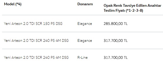 VW Arteon Ağustos 2017 fiyat listesi