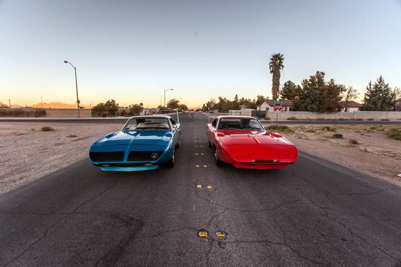Plymouth Superbird (Mavi) ve Dodge Charger Daytona (Kırmızı)